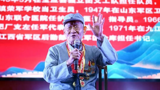 诗会特别邀请两位年逾九旬的抗战老兵胡琏、杨振环亲临现场。他们以亲身经历讲述烽火岁月的革命故事,带领观众穿越时空,重温峥嵘历程。老兵们坚毅的目光与铿锵的话语,让在场师生深刻感受到“一寸山河一寸血”的家国情怀,掌声数次响彻全场。