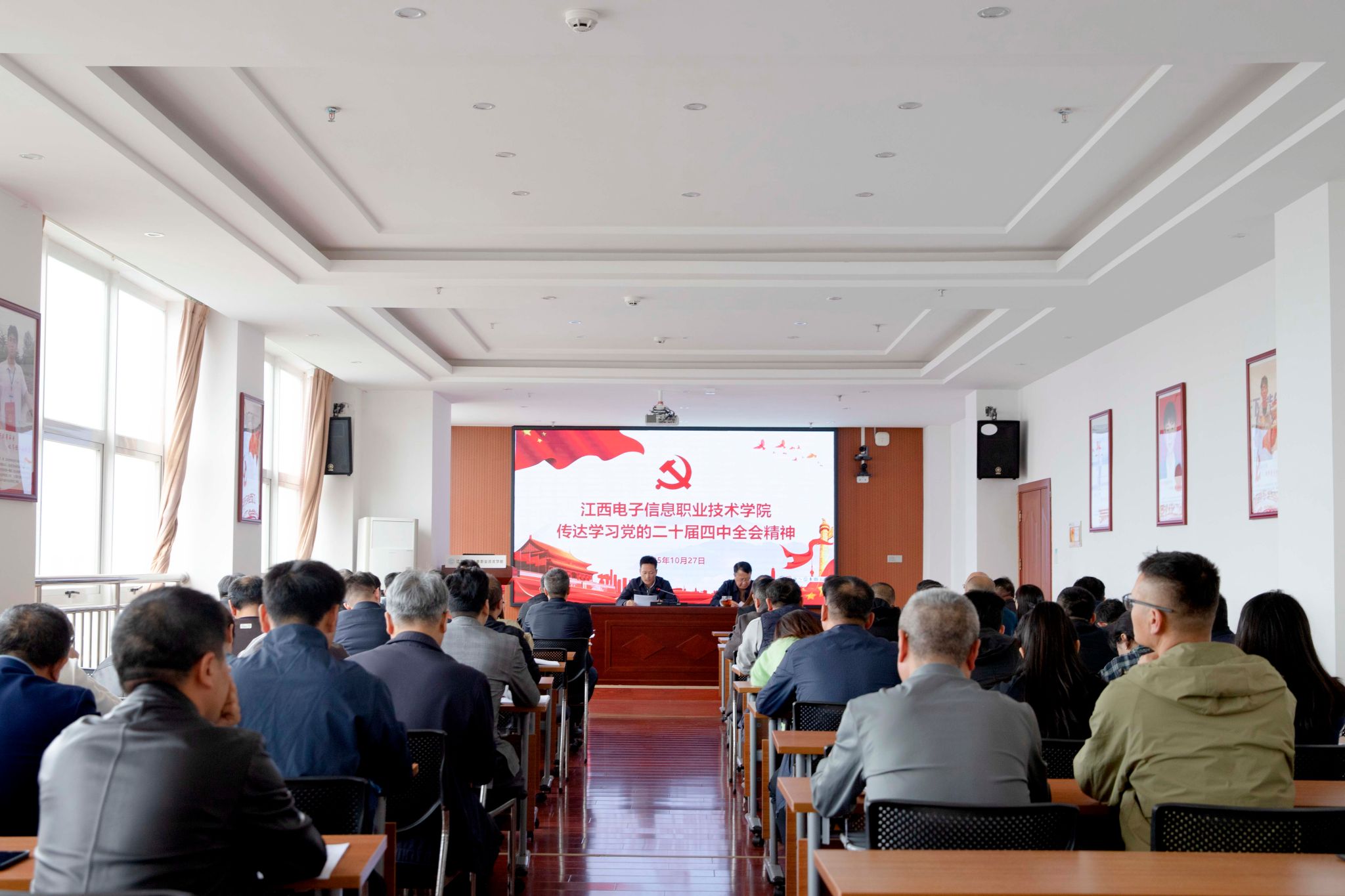 10月27日上午,江西电子信息职业技术学院召开中层以上干部大会,专题传达学习贯彻党的二十届四中全会精神。学校党委书记肖红秋主持会议并作总结讲话。在家校领导、全体中层干部及思政课教师参加会议。
