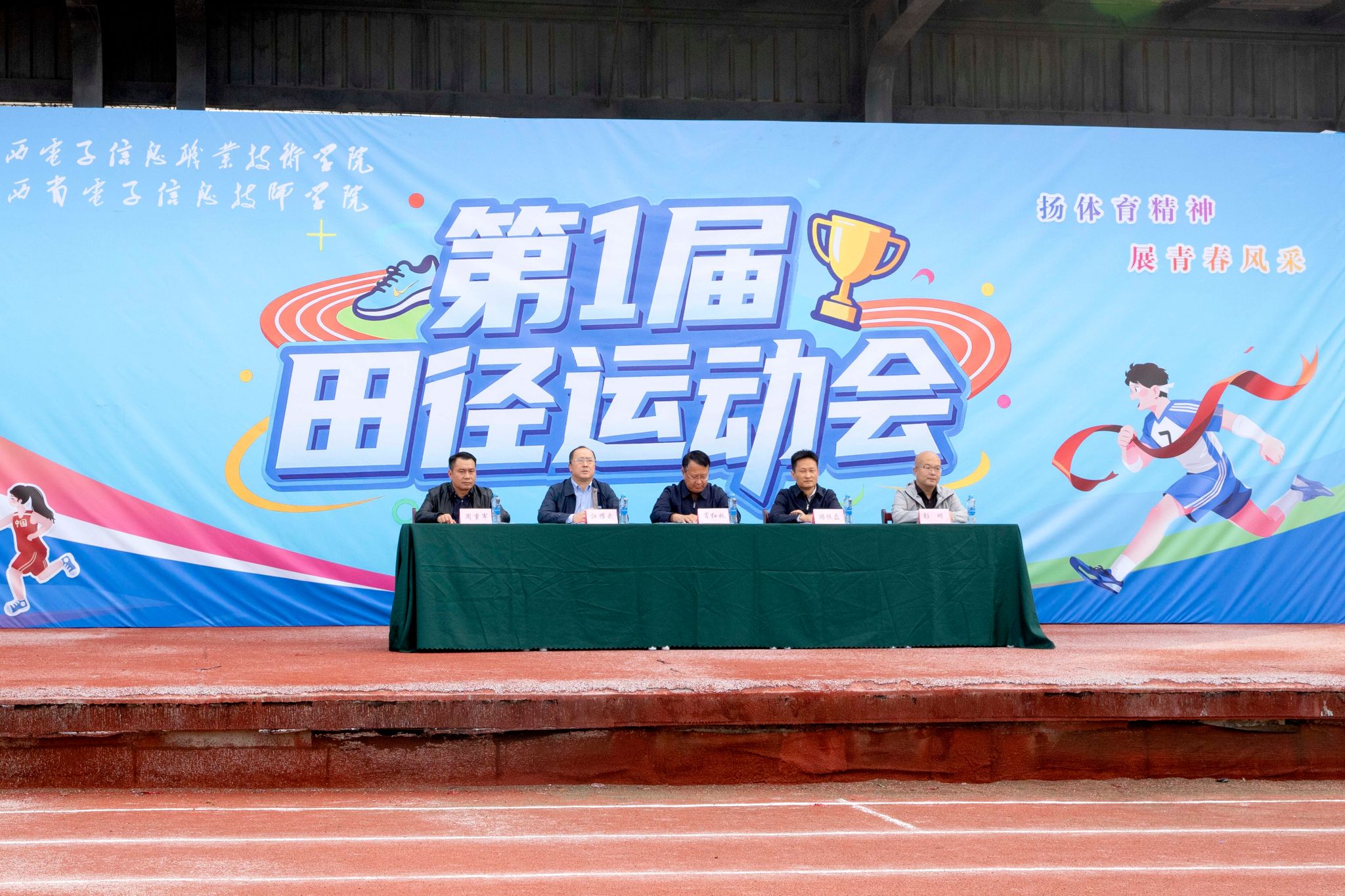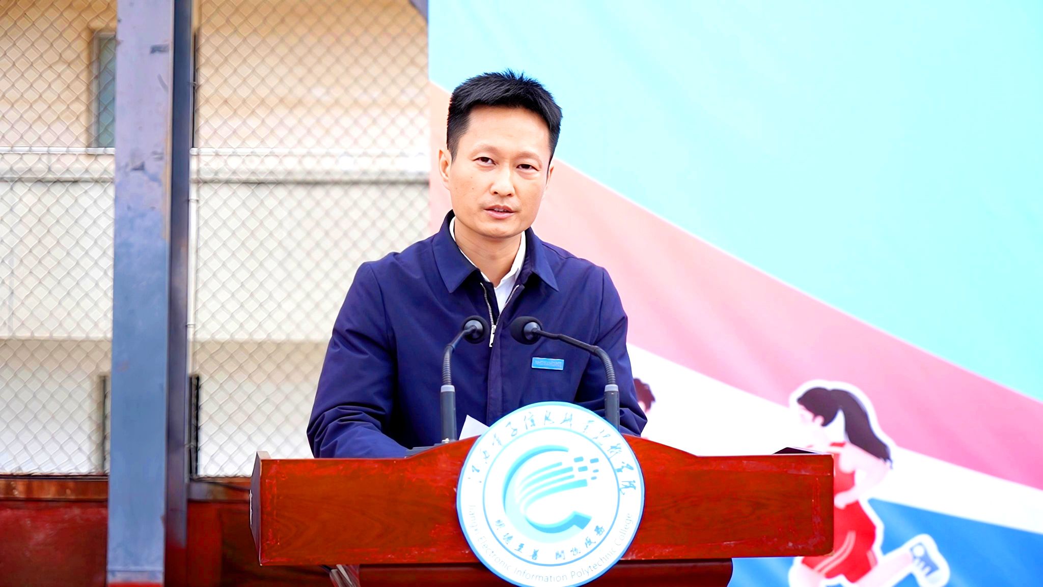 开幕式上,学校党委副书记、院长游振磊致辞。他指出,第一届学生运动会的举办,既是学校深化“体教融合”,落实“健康第一”的具体实践,更是对全校学子精神风貌、身体素质与团队协作能力的一次 “青春大检阅”。同时,游院长向全体师生提出三点殷切期待:一是希望大家能真正爱上运动,享受运动带来的快乐与自信;二是期待以此次运动会为契机,带动更多同学 “放下手机、走出寝室、奔向操场”;三是愿每一位参与者都能在比赛中赛出水平、赛出风格,更要赛出健全的人格和阳光的心态。