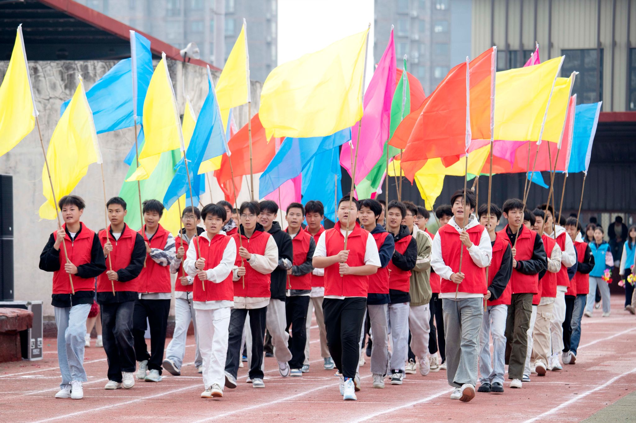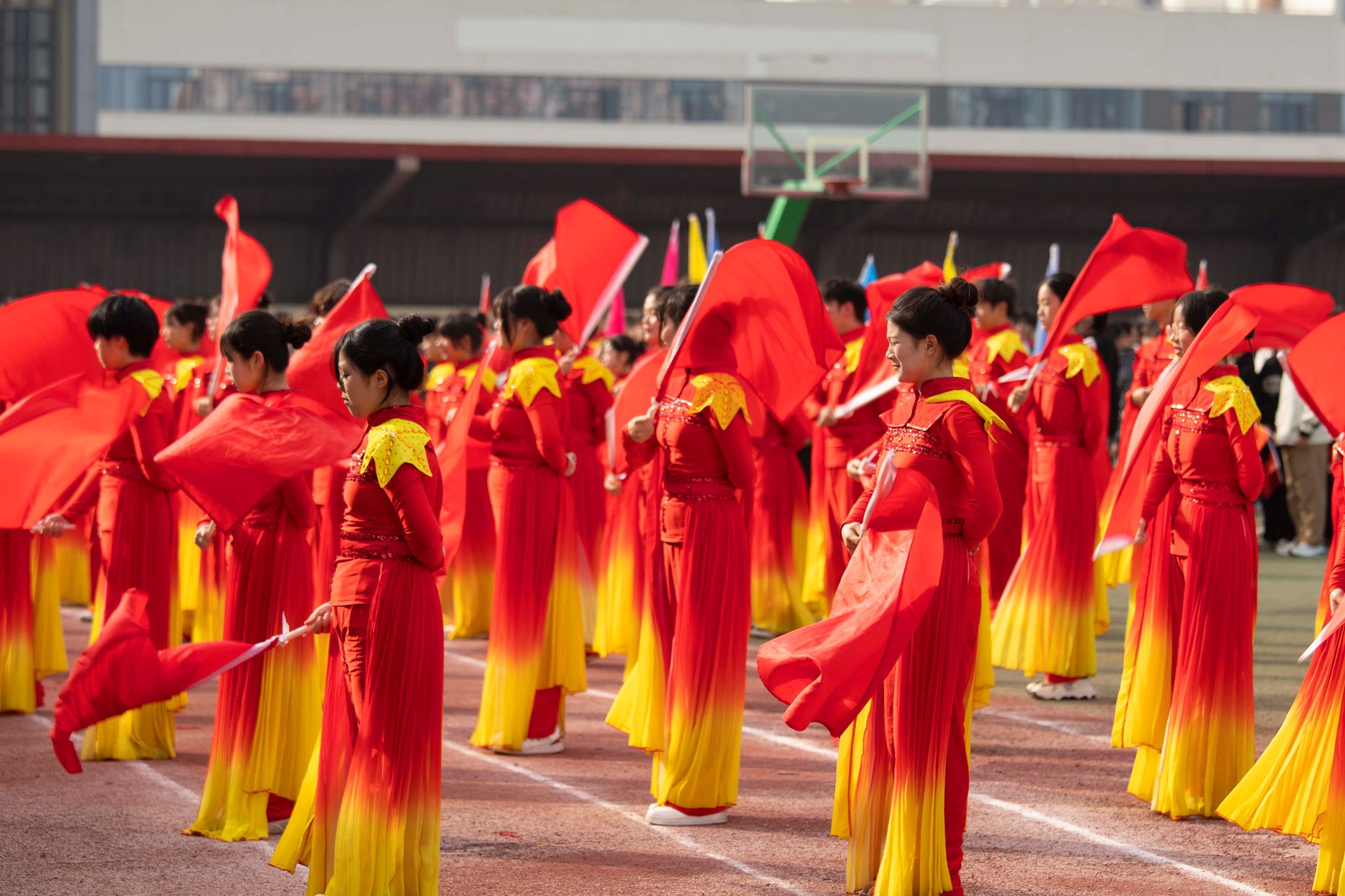 彩旗队手持五彩旗帜,迎风挥舞时如流动的彩虹,为赛场注入灵动色彩。